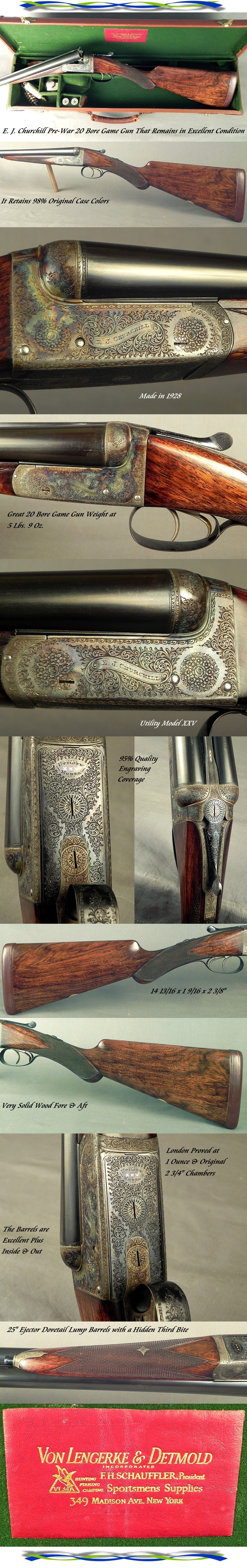 #3595, E. J. Churchill (Gunmakers) Ltd., 39 to 42 Leicester Square, London: A Excellent Pre-War Churchill Boxlock Ejector 20 Bore Game Gun Utility Model XXV with 95% Engraving Coverage and 98% Original Case Colors that remains in Excellent Condition, Made in 1928, 25" Ejector Dovetail Lump Barrels with a hidden rib extension third bite, Proved in London at 1 ounce and original 2 3/4" chambers, .613 .004 & .007" (Skt.I & Imp.Cyl.), Original 2 3/4" chambers, Double triggers, Splinter forend with an Anson frontal release, Prince of Wales pistol grip stock at 14 13/16 x 1 9/16 x 2 3/8" over a 3/4" leather pad, Neutral stock for the right or left hand, Great 20 Bore weight at 5 lbs. 9 oz., Very nice wood, 95% coverage of period rose and scroll engraving, The original barrel blue at 95%, The original case colors at 98% and remain bright and vivid, The stock finish at 96-97%, The checkering is at 99%, The barrels inside & out remain in excellent plus condition and completely free of any dings or pits, The striking on the barrels are excellent, It is cased in a very small original maker's leather cornered leather trunk with a Von Lengerke & Detmold trade label from 349 Madison Ave, in New York. The barrels remain on the face, They have a pronounced chime. On walk up bird shooting over dogs 25" barrels work absolutely as efficient as longer barrels in the hands of the average upland hunter. If you can prove me differently, I will give you this gun plus pay the shipping to you. Here is a really neat Pre-War game gun inside and out that remains in excellent condition with mechanics that will last another lifetime.
