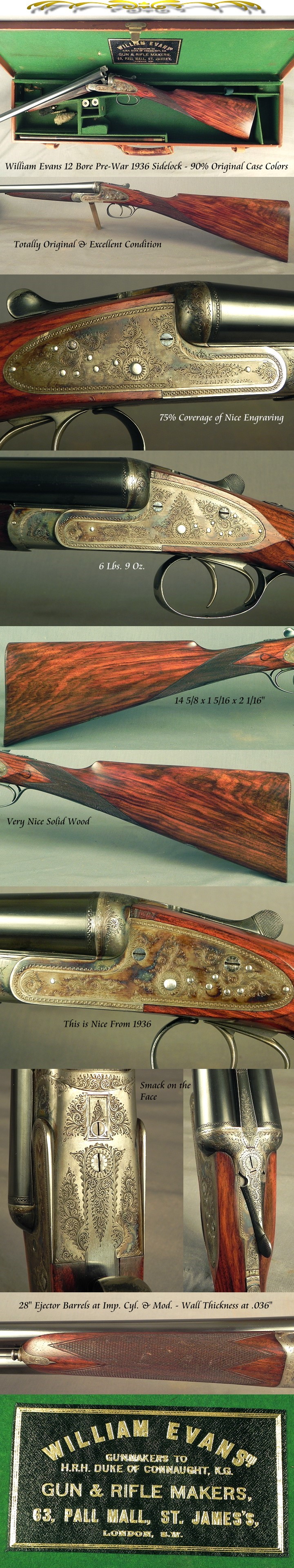 #17400, William Evans, 63 Pall Mall, St. James's, London: A Totally Original and Excellent Condition Pre-War Evans Bar Action Sidelock Ejector 12 Bore Game Gun with 90% Original Case Colors, Made in 1936 with 28" Ejector Dovetail Lump Barrels with a rib extension Dolls Head Third Bite, London Nitro Proved at 1 1/8 ounce with 2 1/2" chambers, The bores at .728 .012 & .017" (Imp.Cyl. & Mod.), 2 1/2" chambers, Wall thickness on the right and left barrel at .036", Bushed strikers, Double triggers, Splinter forend with a frontal Anson release, Straight hand stock at 14 5/8 x 1 5/16 x 2 1/16" over a 100% full faced checkered butt, Slight Cast-Off for the right hand, 6 lbs. 9 oz., 75% coverage of very nice scroll engraving that is well cut, 90% original case colors remain that are bright and vivid on both lock plates, The breech face has 95% case colors remaining, The barrels with 98% original blue with superb barrel striking, The buttstock and forend with original oil finish at 90% with handling marks only, The checkering remains at 97%, The bores are as new, It is tight on the face with the top lever laying well to the right, The barrels have a nice chime. It is cased in the original factory leather trunk with the original trade label and original accessories. Here is an original Pre-War Evans Sidelock Ejector that remains as solid as one could hope to find.