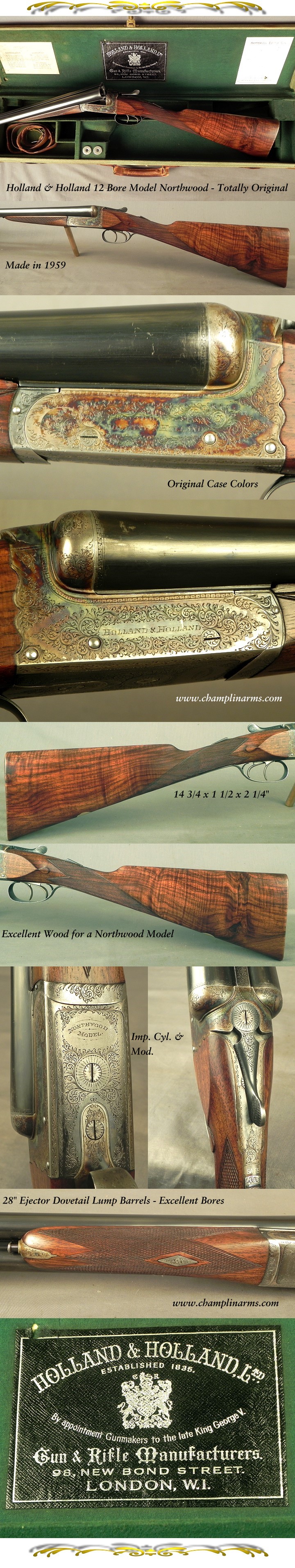 #37015, Holland & Holland, 98 New Bond Street, London: An Original 12 Bore Holland & Holland Model Northwood Deluxe Anson & Deeley Boxlock Ejector Made 1959 with 28" Dovetail Lump Barrels at .728 .009 & .021" (Imp.Cyl. & Mod.), Original 2 1/2" chambers, Proved at 3 Tons, Scalloped action back, Double triggers, Splinter forend with a Frontal Anson & Deeley release, Straight hand stock at 14 3/4 x 1 1/2 x 2 1/4" over a full face checkered butt, Only 6 lbs. 6 oz., 85% coverage of scroll engraving, A very nice piece of wood with a lot of fiddleback and excellent black/brown contrast, It is one of the better pieces of wood I have seen on a Model Northwood, This piece retains 94% original case colors, 97% original barrel blue, The wood with original finish that remains 96% with very light scattered handling marks, The checkering is at 99%, The bores are excellent plus and it remains smack on the face. The whole is cased in an original leather cornered Canvas trunk with original trade labels. This piece handles and points with ease and is the ideal light upland gun at 6 lbs. 6 oz. for those that want a very attractive priced English game gun.