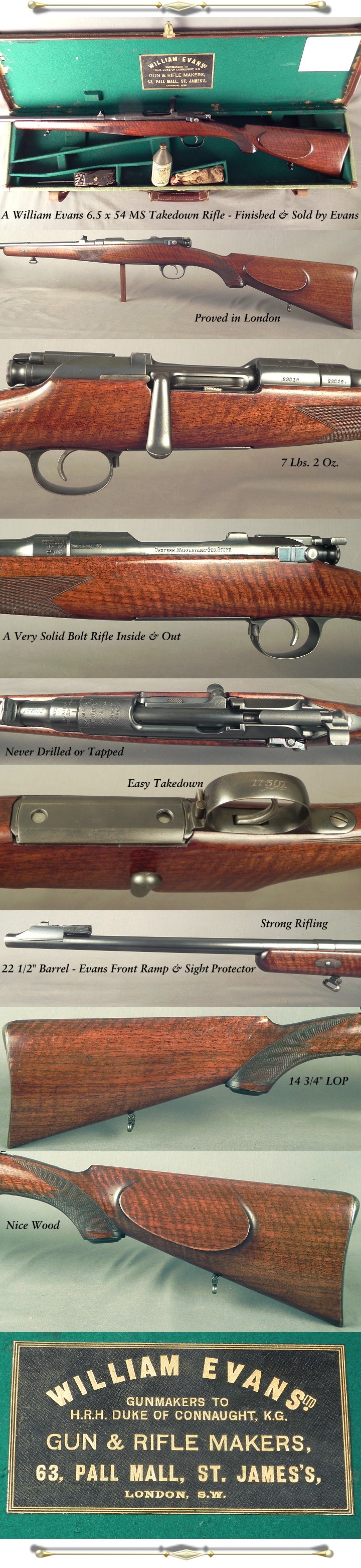 #17301, William Evans, 63 Pall Mall, St. James's, London: An Original Cased William Evans Takedown 6.5 x 54 Mannlicher Schoenauer (256 Rimless or 256 Mannlicher). Finished by Evans in 1935, Total 1903 Mannlicher Schoenauer Barreled Action That was Finished, Cased and Marked by Evans and Proofed in London. The Mannlicher Serial # is 22616 and the Evans # is 17301. Evans engraved their name and address on the barrel along with their serial number on the barrel cylinder, they also engraved "Made In Austria & 256 Rimless" on the barrel cylinder. The London proof marks are on both the barrel and the MS action. Evans added a front sight ramp with a spring actuated fold-over sight protector that has a fold-up night sight. 22 1/2" barrel with 1 fixed standing rear sight marked at 150 yards, Barrel band with a locking cross pin 2 3/4" back of the forend tip, Never drilled or tapped for scope mounts and a scope was never installed, Single trigger, Factory bolt safety, Nice wood with a lot of fiddleback, Original sling eyes on the stock, Bakelite type grip cap, Cheekpiece, 14 3/4" LOP over the original trapdoor buttplate, 7 lbs. 2 oz., This piece remains original, It is cased in its original brass cornered leather trimmed canvas trunk with the proper and correct trade label, The barrel blue is at 95%, The receiver blue is at 96%, The bottom metal remains at 90%, The stock with original finish is at 75% with scattered hunting marks but it remains as solid as a rock, The checkering remains at 94%, The bore has sharp rifling the entire way without any pits, It is grayed in the groove but in near excellent condition. A very neat English/Austrian rifle in a very practical & functional cartridge that will be the ultimate trick for dispatching deer sized animals and excellent for wild hogs.