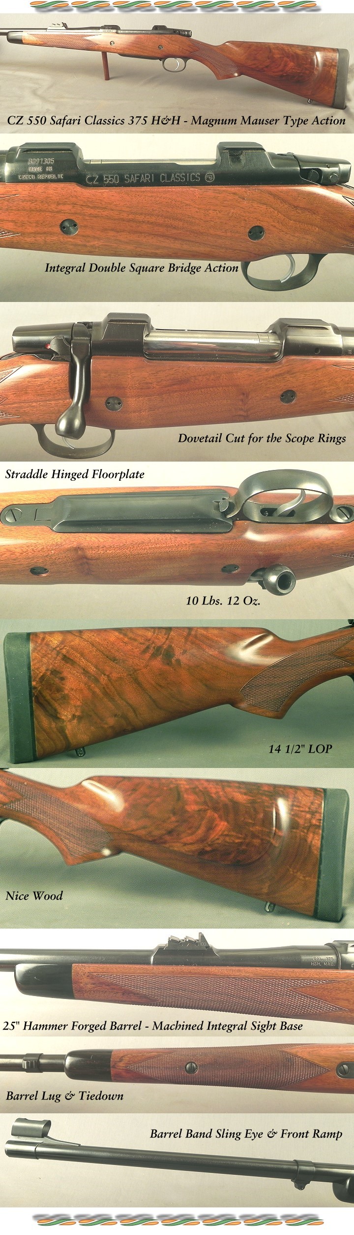 CZ 375 H&H - MODEL CZ 550 SAFARI CLASSICS - DOUBLE SQUARE MAGNUM LENGTH FLAT TOP RECEIVER with DOVETAIL CUTS - CONTROLLED ROUND FEED - 14 1/2" LOP - The Receiver Will Accept Current CZ Scope Rings, Talley or Warne - Straddle Hinged Floorplate - 10 Lbs. 12 Oz. - Barrel Band Sling Eye - Upgraded Wood