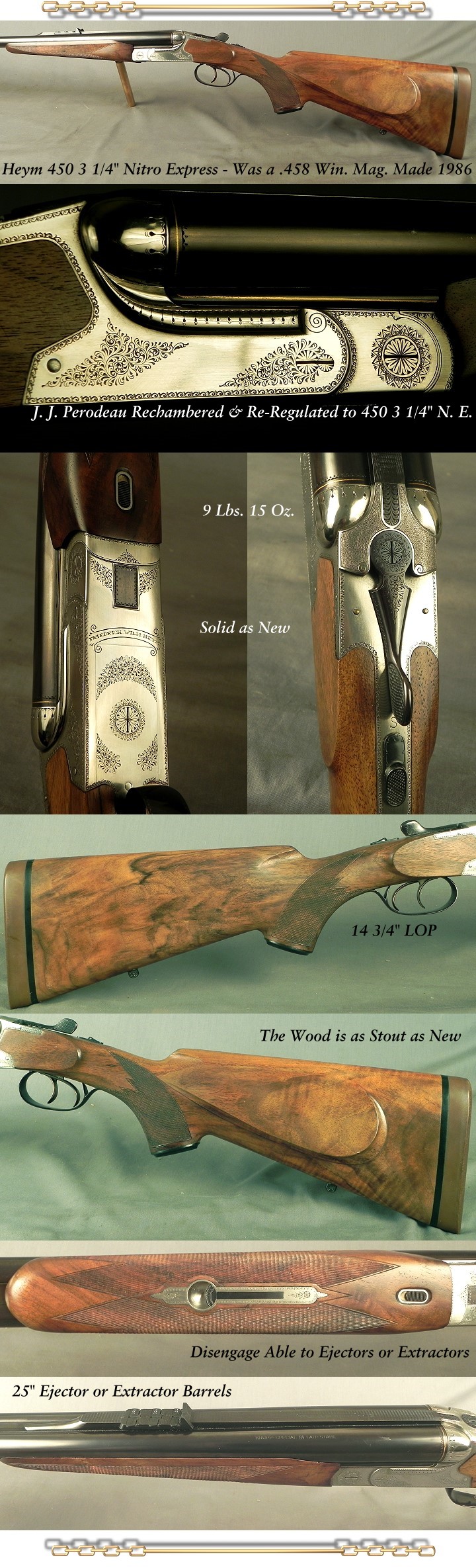 #81907, Heym 450 3 1/4" Nitro Express Model 88B Professional Hunter; Made 1986 as a .458 Win. Mag. and then our Gunmaker, J. J. Perodeau, rechambered it to 450 3 1/4" and re-regulated to the current 450 3 1/4", The action flats nicely engraved to mark the 450 3 1/4", Made with their Anson type action with overhead sears, Safety sears and a Greener type crossbolt action body, The piece is with 25" Ejector barrels, 1/4 rib with 1 standing and 3 folding, Double triggers with the front articulated, Bolstered frame, Scalloped action back, Cocking indicators, Locking screws on key screws, Disengage able ejectors with the slide on the bottom of the forend at the knuckle so you can select either extractors or ejectors, All later Heym double rifles did not offer this feature, Slight beavertail forend, Shadowline Cheekpiece, Sling eyes, Steel grip cap, 14 3/4" LOP over a 1" pad, 9 lbs. 15 oz., Typical 88B Safari hand cut 20% engraving coverage, Full length trigger guard tang found only on the 88B Safari to a steel grip cap, Fairly nice wood with excellent grain layout for years of tough use, It has 99% original barrel blue, The original wood finish at 98-99%, The checkering remains at 100%, The bores are absolutely new. In the field of current double rifles, the Heym is only one of two that our shop feels comfortable with to go the course with reliability and function over the long haul of serious shooting and African hunting. These earlier Heym 88B's were the best they made plus it has hand cut engraving and features their current big bores don't have. We have had excellent results by converting .458 Win. Mag. double rifles to the great Rimmed 450 3 1/4" Nitro Express. Excellent cartridge for Elephant and Cape Buffalo with .458 diameter bullets everywhere.