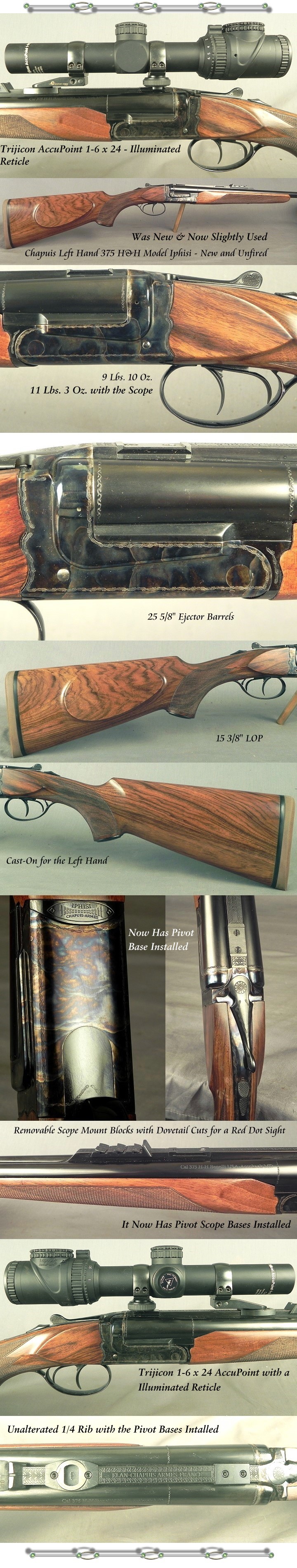 CHAPUIS LEFT HAND 375 H&H - MODEL IPHISI CLASSIC - VERY NICE WOOD - CASE COLORED FRAME - PIVOT MOUNTS - TRIJICON 1-6x24 SCOPE - 25 5/8" EJECTOR BARRELS - 15 3/8" LOP - 1/4 Rib with Express Sights - 9 Lbs. 10 Oz. w/o Scope & 11 Lbs. 3 Oz. with - Overall it Remains in 97% Condition - Nice for the Price