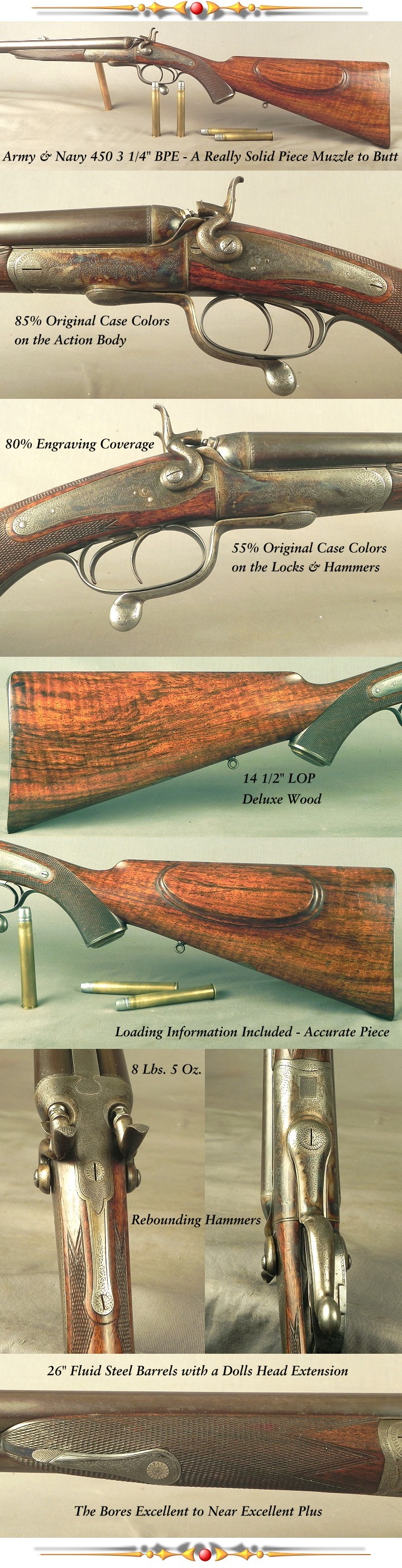 #11320, Army & Navy CSL, London: A 450 3 1/4" Black Powder Express Made in 1900, Henry Jones Underlever Rebounding Hammer Double Rifle with 26" Extractor Fluid Steel Dovetail Lump barrels with a dolls head rib extension, Flat rib with 1 standing & 1 folding, Double triggers, Long trigger guard tang to an engraved steel grip cap, Shadowline cheekpiece, Sling eyes, 14 1/2" LOP over a 1/3 checkered steel buttplate, 8 lbs. 5 oz., 80% coverage of very nice scroll engraving that is very well cut, This nice piece retains 85% original case colors on the frame, The locks and hammers have 55% original case colors, The inside of the forend has 100% colors, The breech face with 99% colors and zero primer burn, The original barrel blue at 60%, The bores are excellent to very close to being excellent plus, Deluxe wood with very nice color and contrast with a lot of fiddleback, A vacant Nickel Silver escutcheon, 80% wood finish with scattered handling marks. The gun comes with loading information and shoots accurately. With both 335 & 341 grain lead bullets, plus 49 grains of H-4198 with 8.5 grains of dacron it will shoot into 2 1/2 to 3" at 50 yards. The average velocity is 1829 fps. This is flat out one solid rifle on both the metal and wood.
