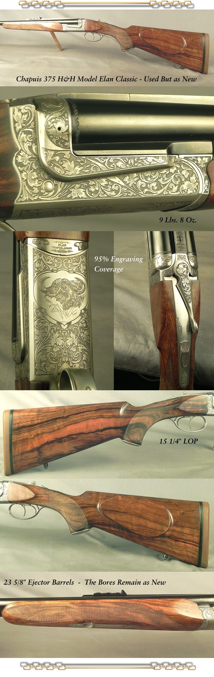 CHAPUIS 375 H&H - USED but as NEW - MODEL ELAN CLASSIC - VERY NICE WOOD - 95% FLORAL ENGRAVING & GAME SCENE - READY for the U. S. & AFRICA -9 Lbs. 8 Oz. - 25 5/8" Ejector Barrels - 15 1/4" LOP - Will cut to your LOP - 1/4 Rib with Express Sights - Removable Blocks in the Rib for Scope Mounts or a Red Dot - Nice for the Price