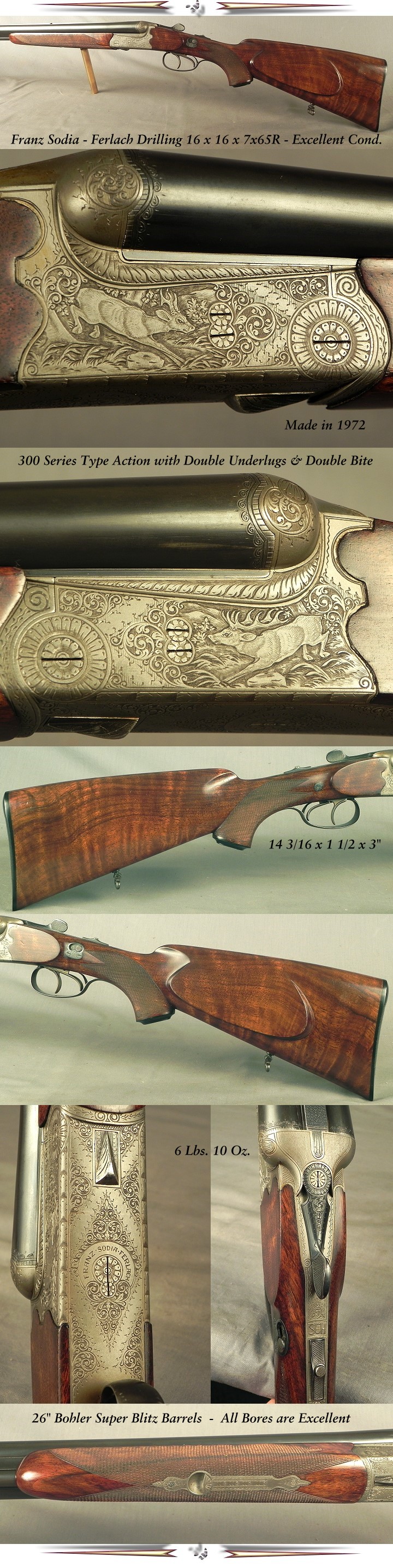 FRANZ SODIA 16 x 16 x 7X65R FERLACH DRILLING - MADE in 1972 - 300 SERIES ACTION with DOUBLE UNDER LUGS & DOUBLE BITE - ALL BORES are EXCELLENT - SOLID PIECE -26" Bohler Super Blitz Steel Barrels - 6 Lbs. 10 Oz. - 14 3/16 x 1 1/2 x 3" - 90% Game Scene Engraving - Overall in 95% Original Condition