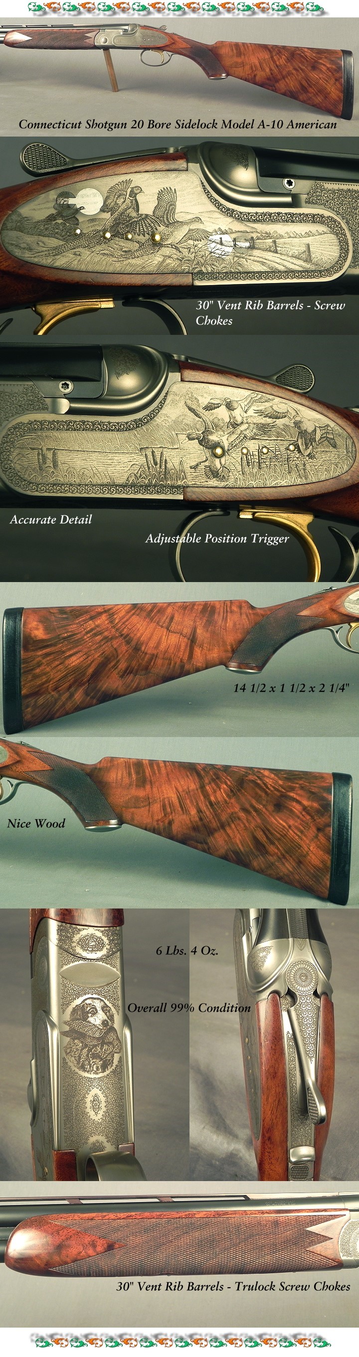 SOLD - #A10-001529, CSMC 20 Bore A-10 American: Connecticut Shotgun Manufacturing Hand Detachable Sidelock Over & Under Game Scene Engraved Model Game Gun, 30 vent rib barrels with factory Trulock screw chokes at .614 .010 & .017", (Skt.II & Tight Mod.), Factory marked I.C. & M., 2 3/4" chambers, Single selective trigger, Adjustable position trigger, Replaceable locking shoulders on the barrel at the breech, Bolstered frame, Game forend with a pull-down Deeley & Edge release, Pistol grip stock at 14 1/2 x 1 1/2 x 2 1/4" over a 3/4" leather pad with plugs for easy removal, It will go 14 13/16" with a 1" pad installed, Slight cast-off for the right hand, 6 lbs. 4 oz.; Excellent American Black Walnut wood with very nice feather, color & contrast, Point pattern checkering, Trigger guard tang extended to the steel grip cap, 96% game bird engraving coverage with very tight scroll, It retains 100% satin French grey finish on the receiver, The original barrel blue at 100%, The buttstock and forend remain at 99% finish, The checkering remains at 100%, The barrels inside & out remain as new. - SOLD